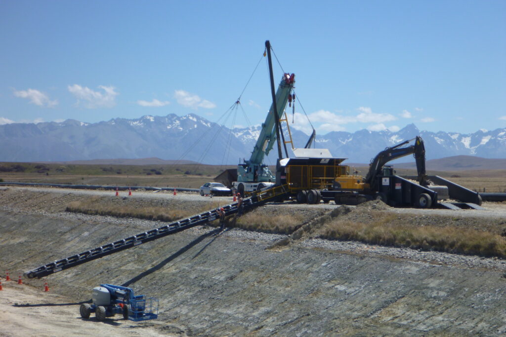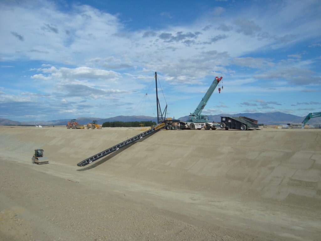 The challenge for Fulton Hogan was to deliver this ballast material from the top section of the invert, which was several metres higher than the canal floor and the deliver the ballast 25 metres out into the centre of the canal floor. This had to be accomplished whilst ensuring the newly laid PVC canal floor was not damaged in the process.