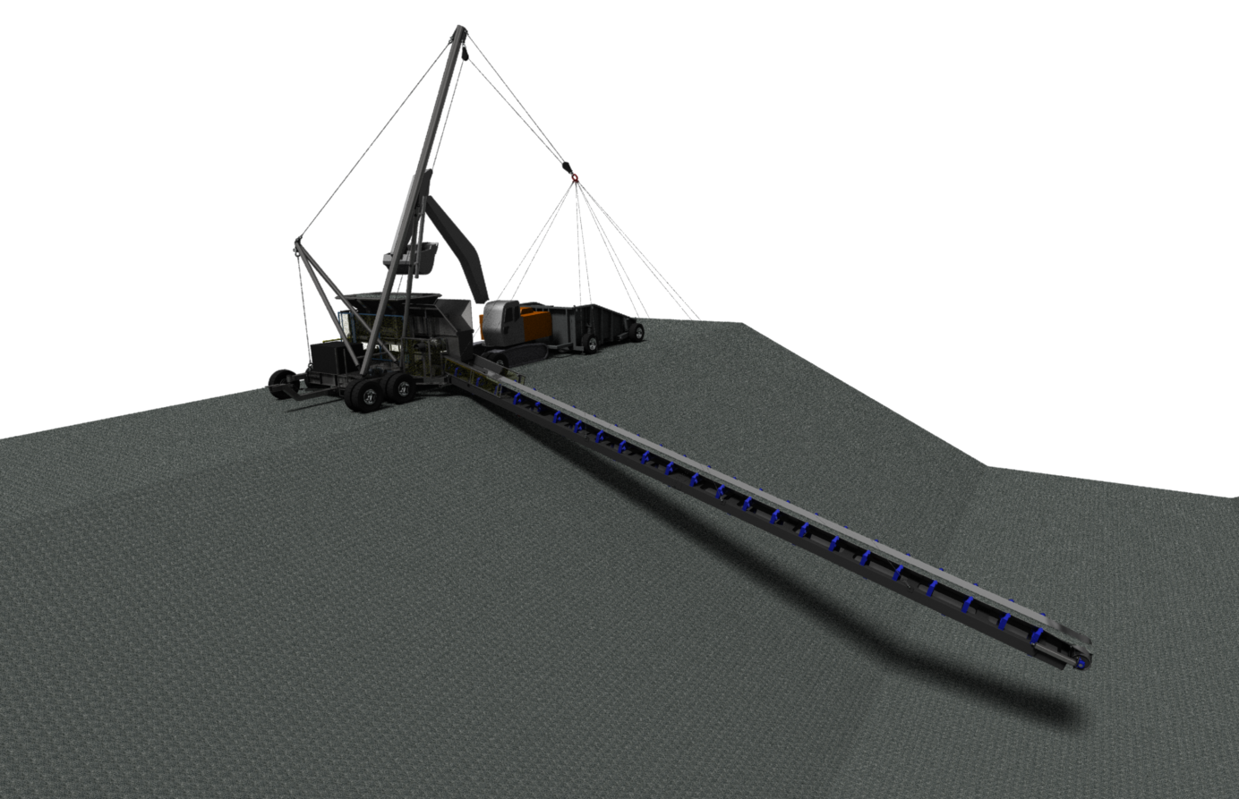 The process created was a Gravel Feeder mobile machine that accepted 30 tonne payloads from articulated dump trucks into a specifically designed steel constructed mobile bin. The product was then retrieved from the bin via a 20 tonne excavator and delivered into a hopper located on a specifically designed trailer mounted hopper. The hopper then fed the product directly onto a belt feeder conveyor in turn delivering the product onto a declining conveyor down to the centre of the canal floor. The process created a delivery rate of 2000 tonnes per day.