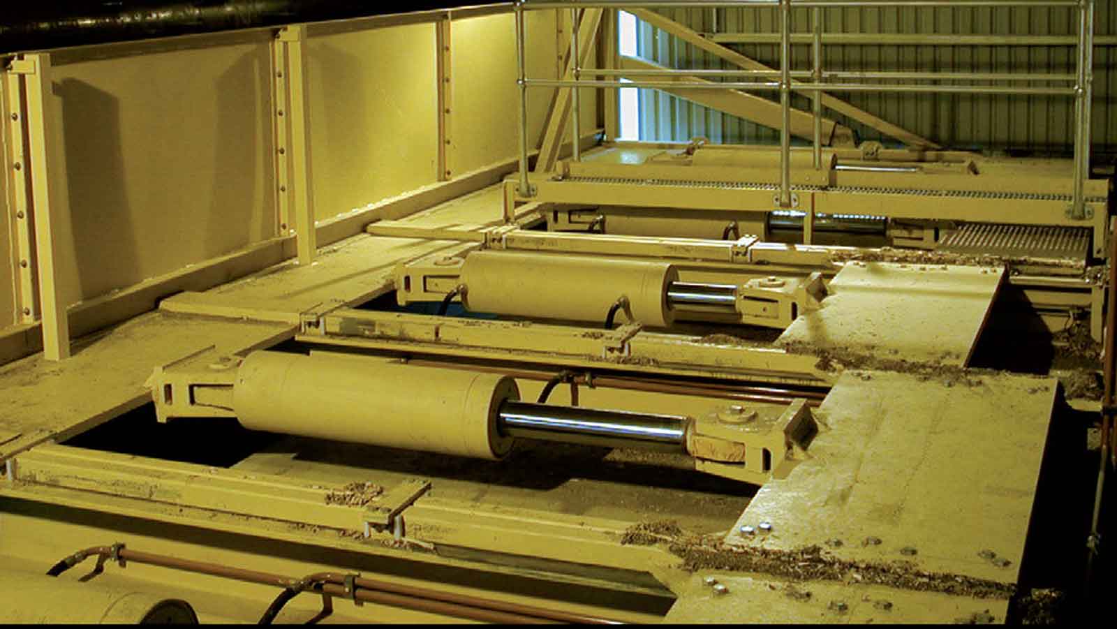 The Push Floor is driven by a hydraulic system that moves a number of parallel pusher frames or ‘ladders’ in reciprocating motion across the bunker flat floor. As it does so it digs the stored bulk solid material from the bunker and delivers it to a screw conveyor or other machines.